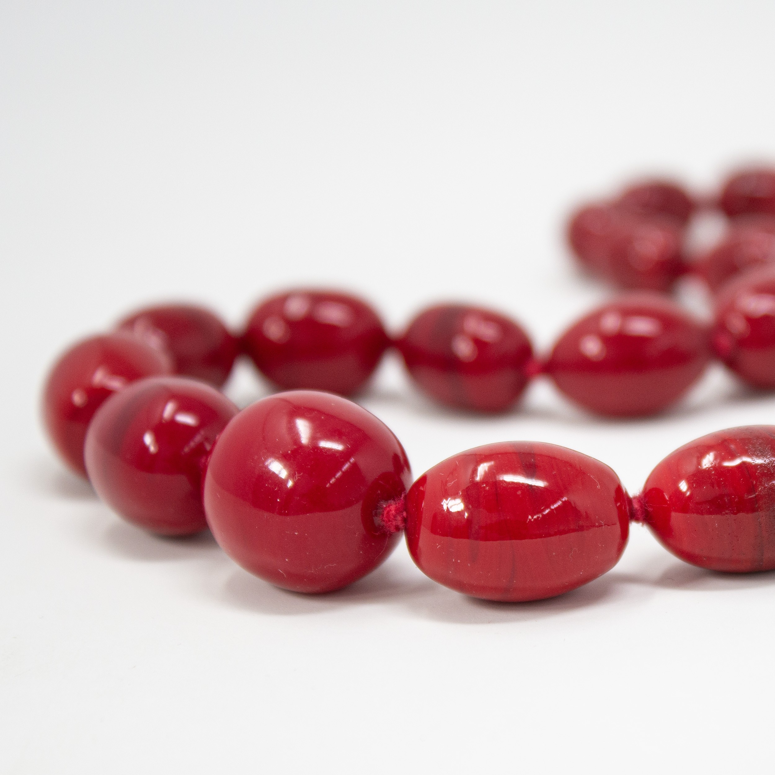 Collana artigianale realizzata con perle ovoidali in pasta di vetro di Murano color rosso corallo, ogni singola perla viene annodata a mano.