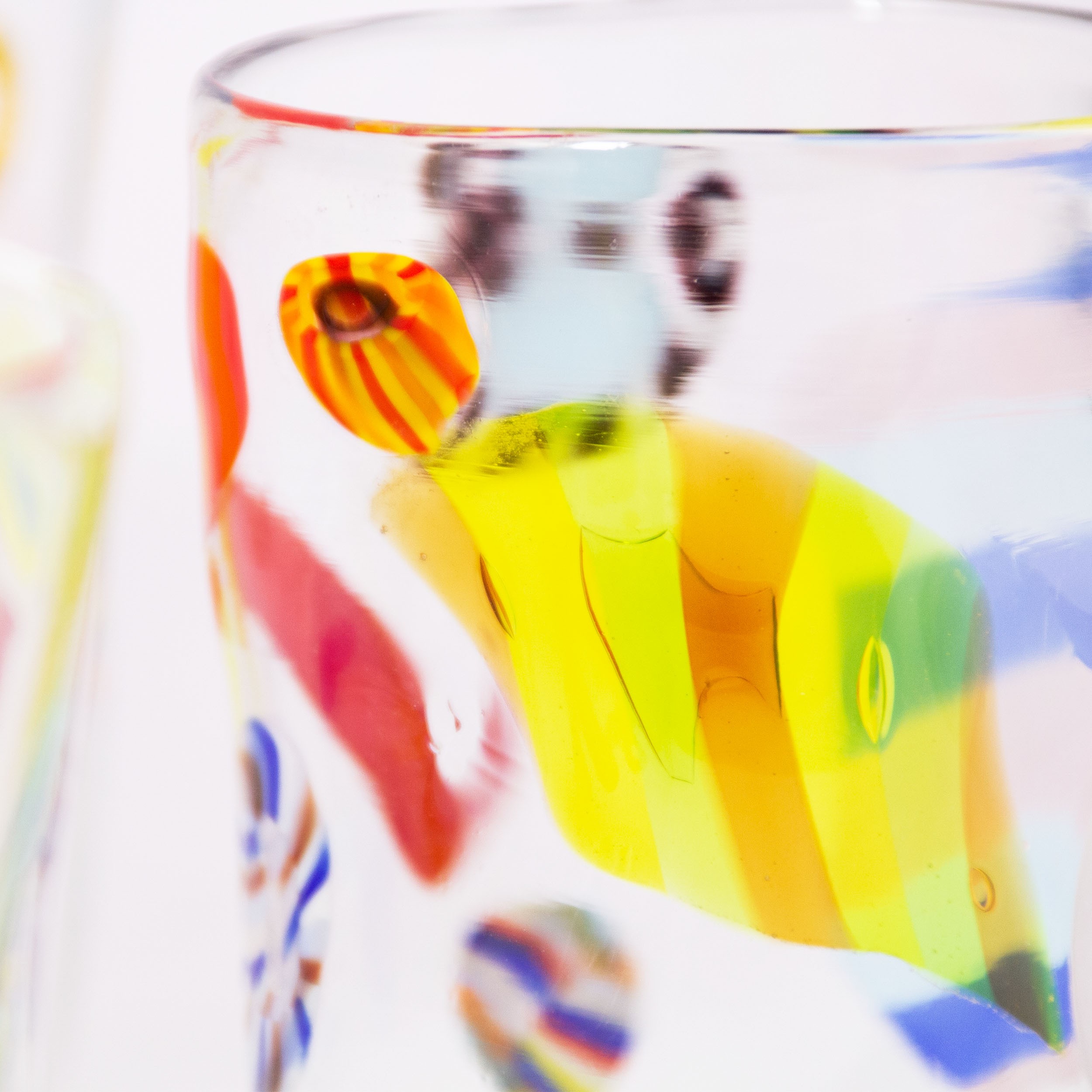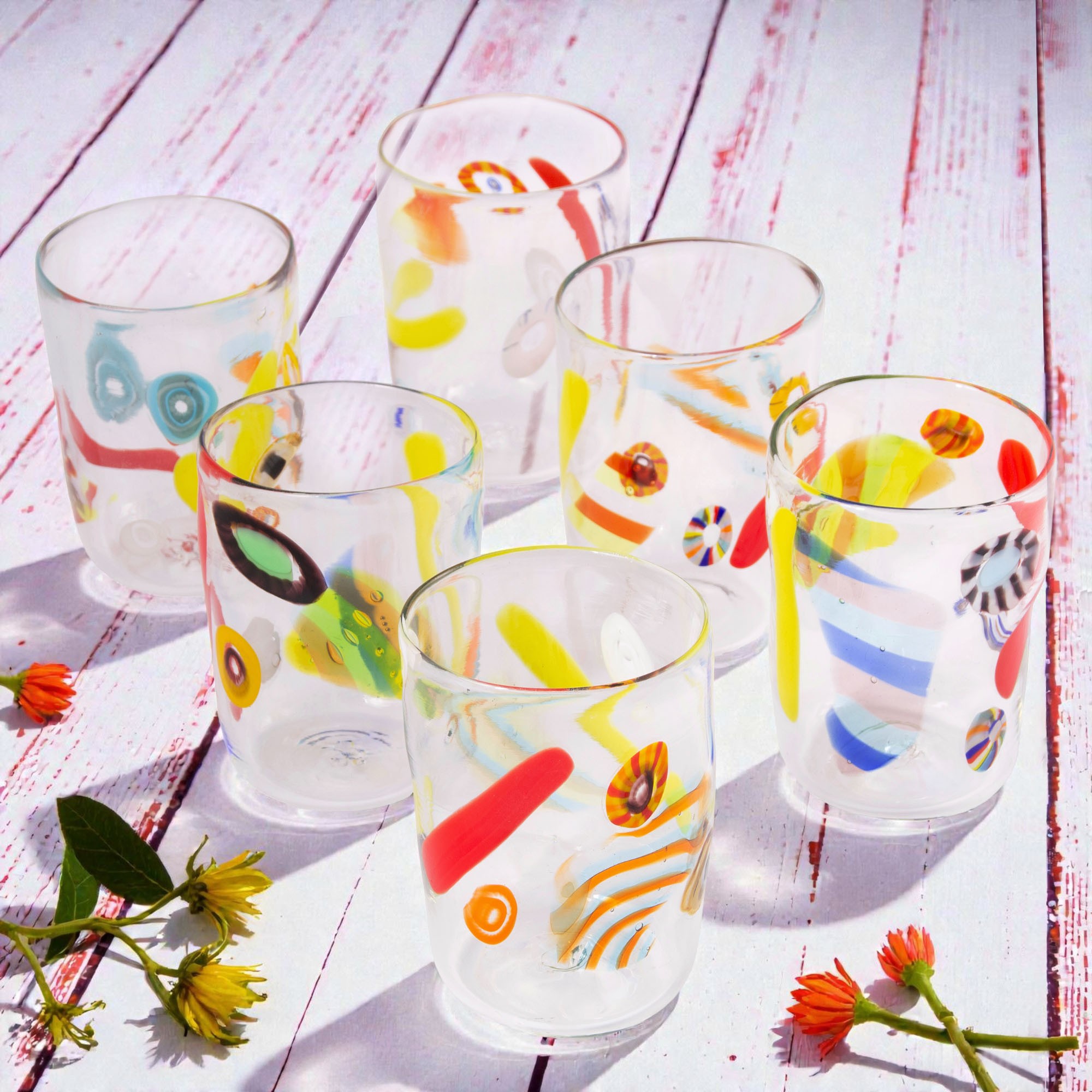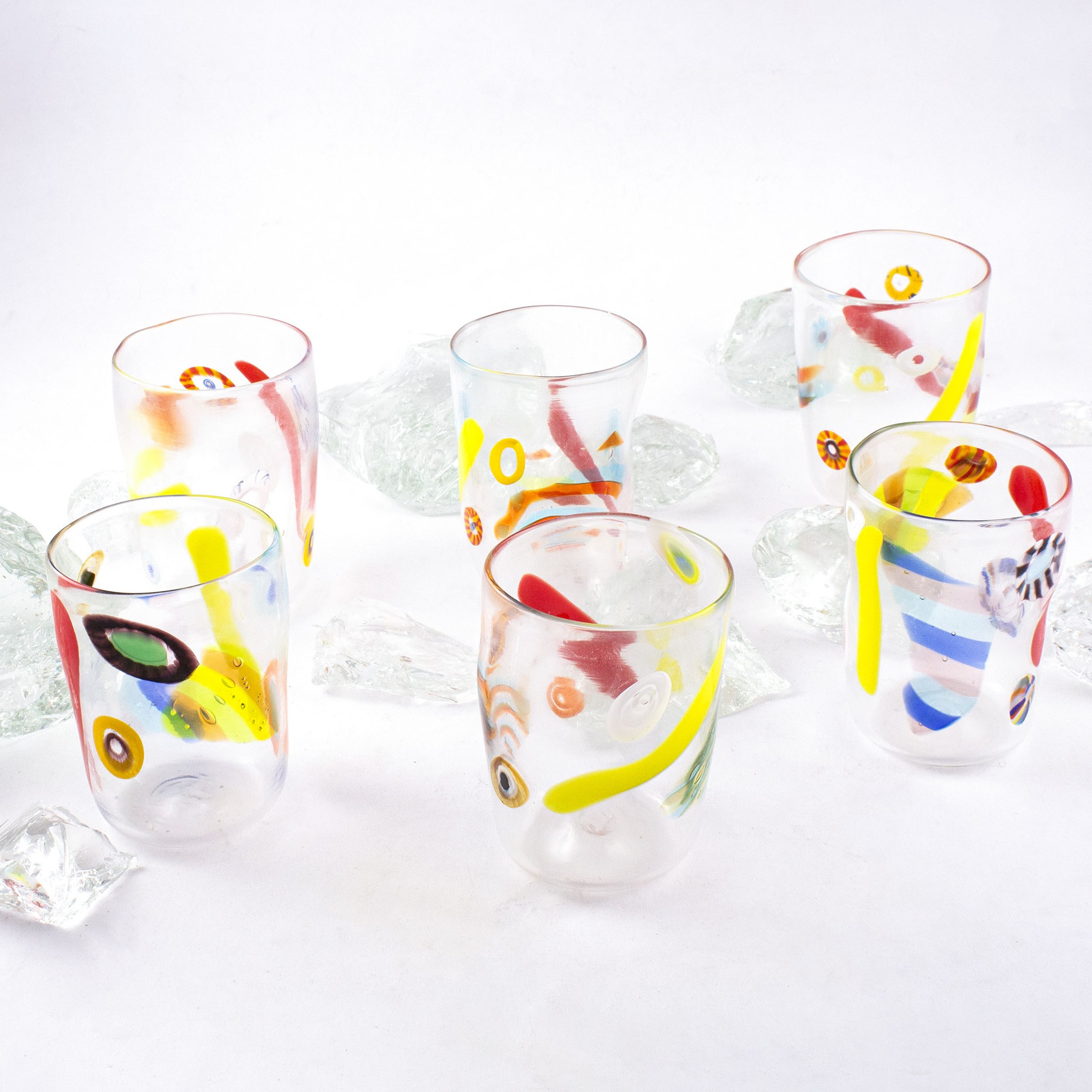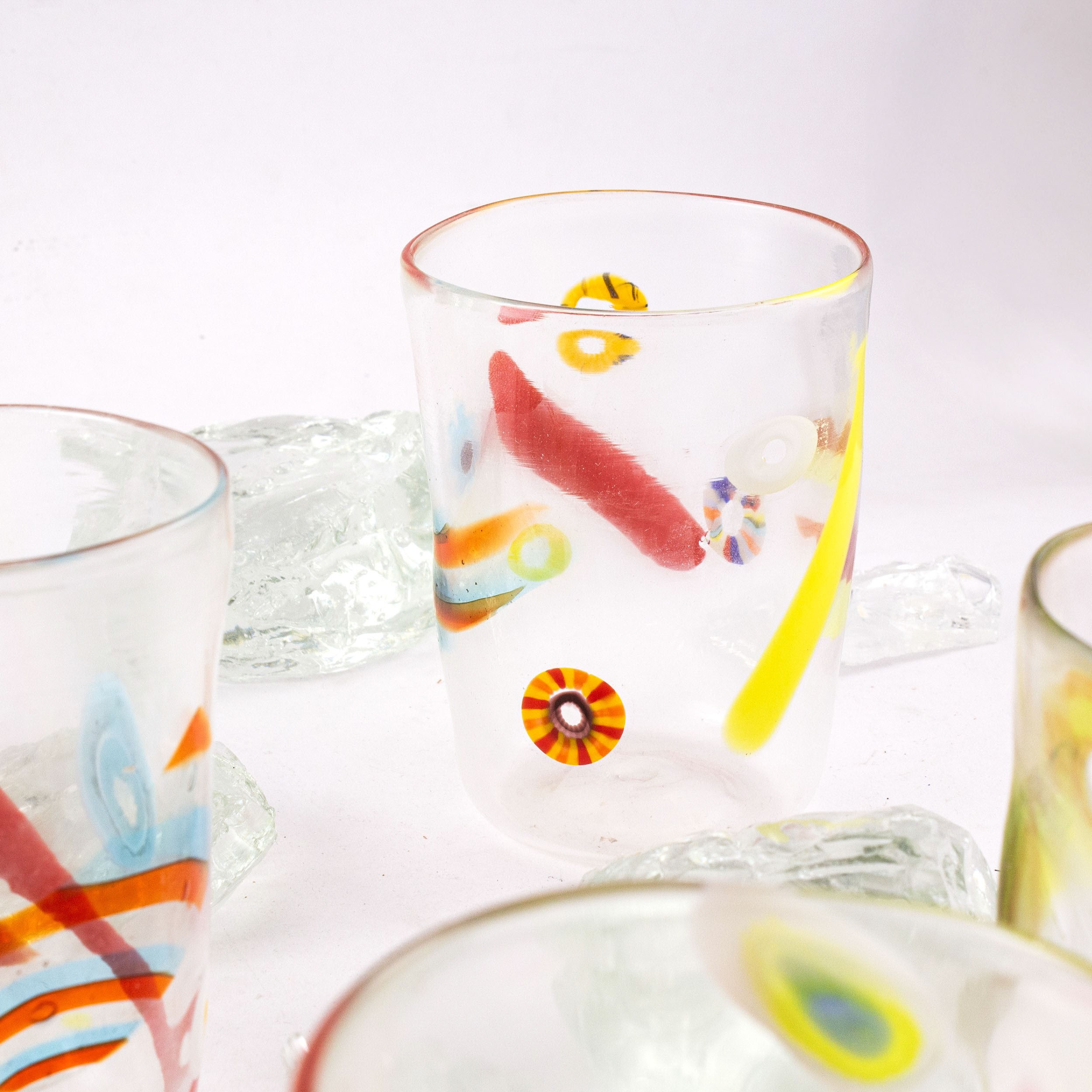 Il vetro trasparente accoglie eleganti canne vitree policrome e murrine, ognuna con i suoi colori e dettagli unici. Il risultato è una collezione vivace e raffinata, dove tradizione e maestria muranese si intrecciano in ogni bicchiere. Perfetti per portare a tavola un tocco di arte veneziana e rendere speciale ogni momento conviviale.