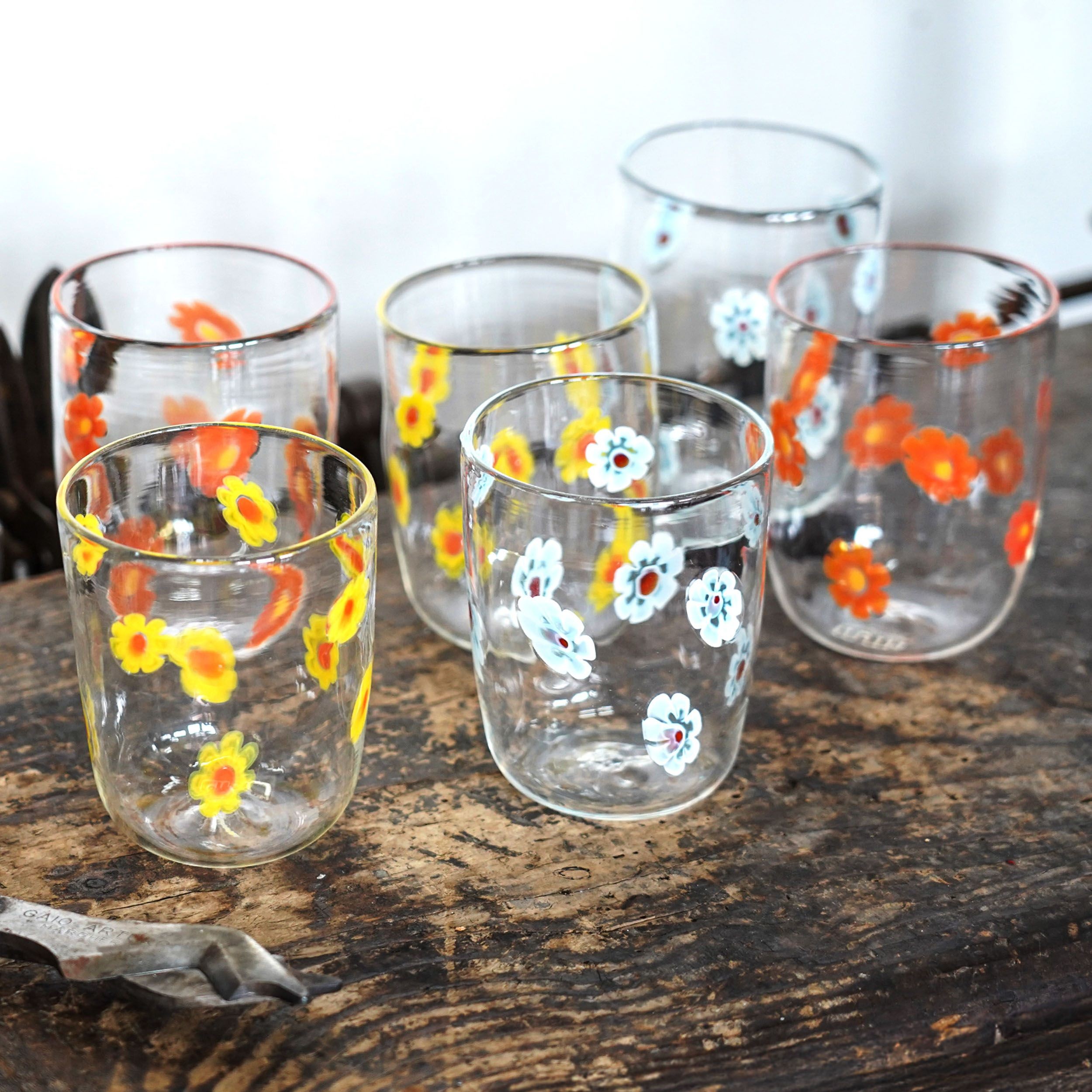 Set di 6 bicchieri artigianali in vetro di Murano trasparente con murrine floreali
