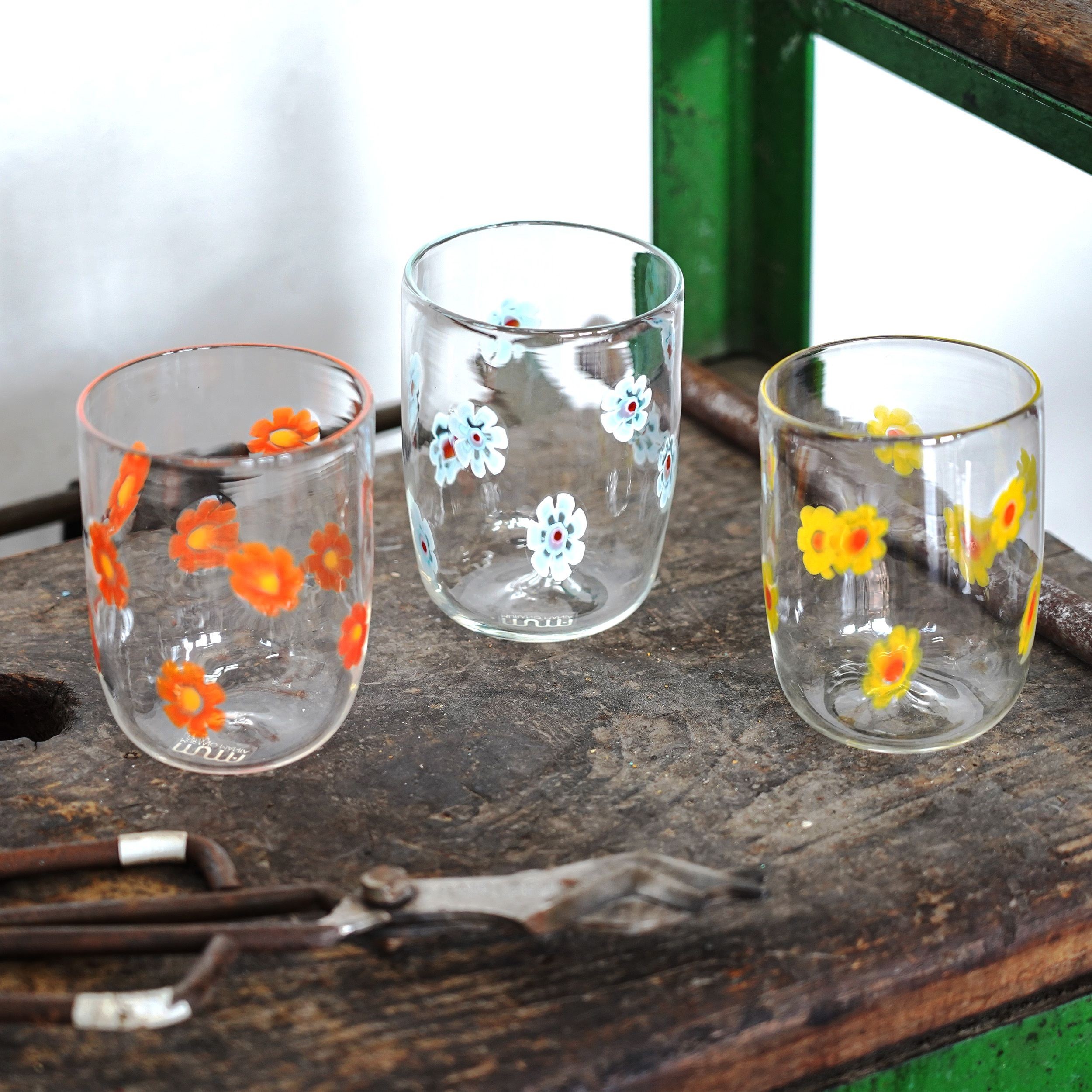 Bicchieri in vetro di Murano realizzati a mano, trasparenti e decorati con delicate murrine a forma di margherita. Ogni pezzo è unico, leggero e luminoso: perfetto per portare sulla tavola un tocco autentico di colore e tradizione muranese.