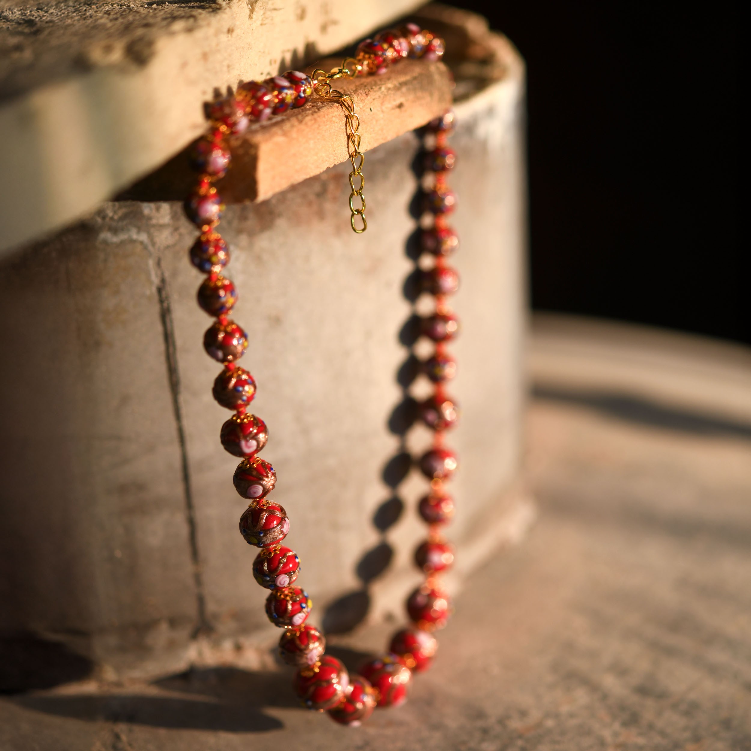 Gioiello artigianale, realizzato con perle tonde in vetro pieno e avventurina con decorazioni floreali in rilievo. Dimensione delle perle a degradé, ogni perla è annodata a mano singolarmente.