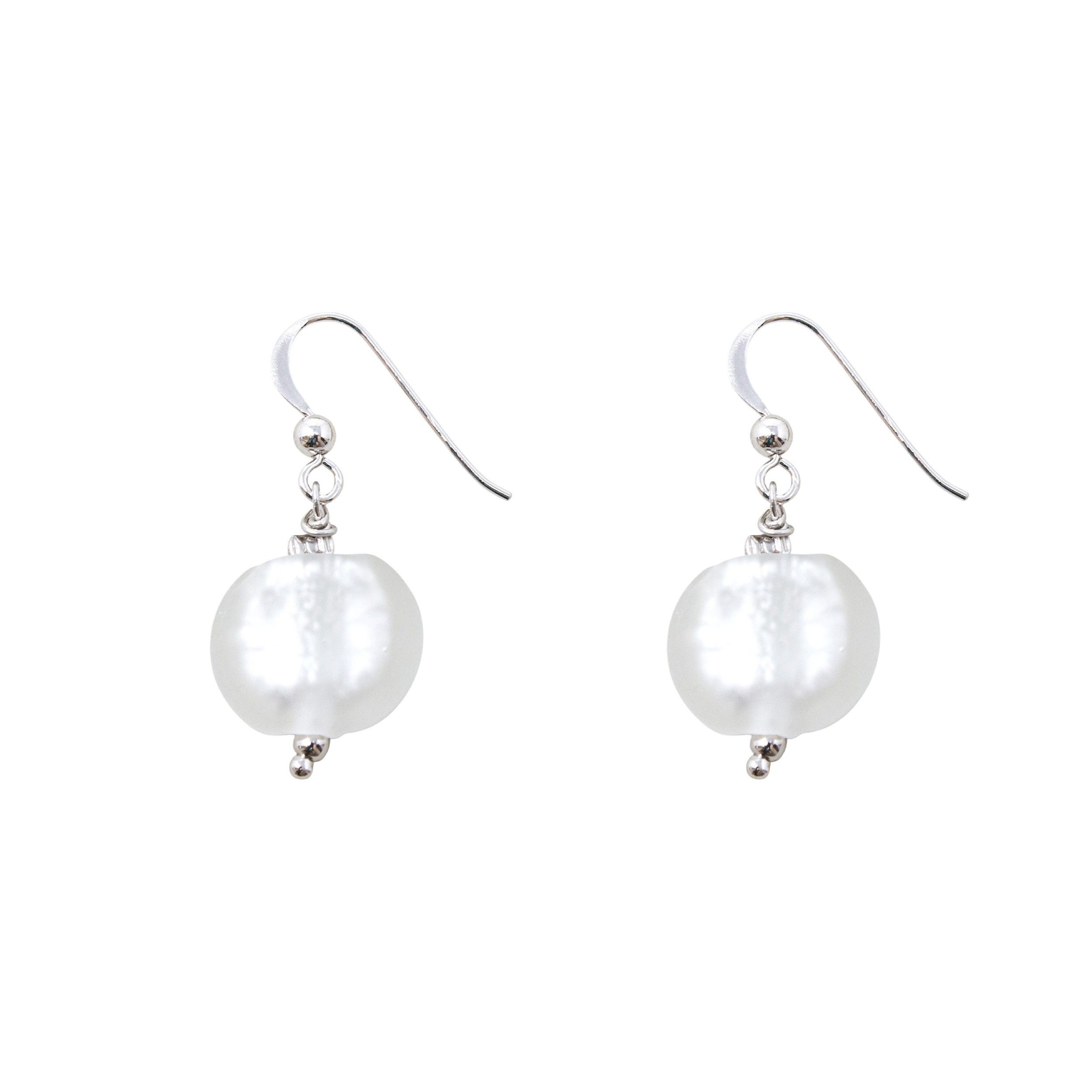 Orecchini artigianali realizzati con perle tonde piatte in vetro di Murano satinato con all’interno foglia argento, montatura leggera a monachella in argento rodiato 925.