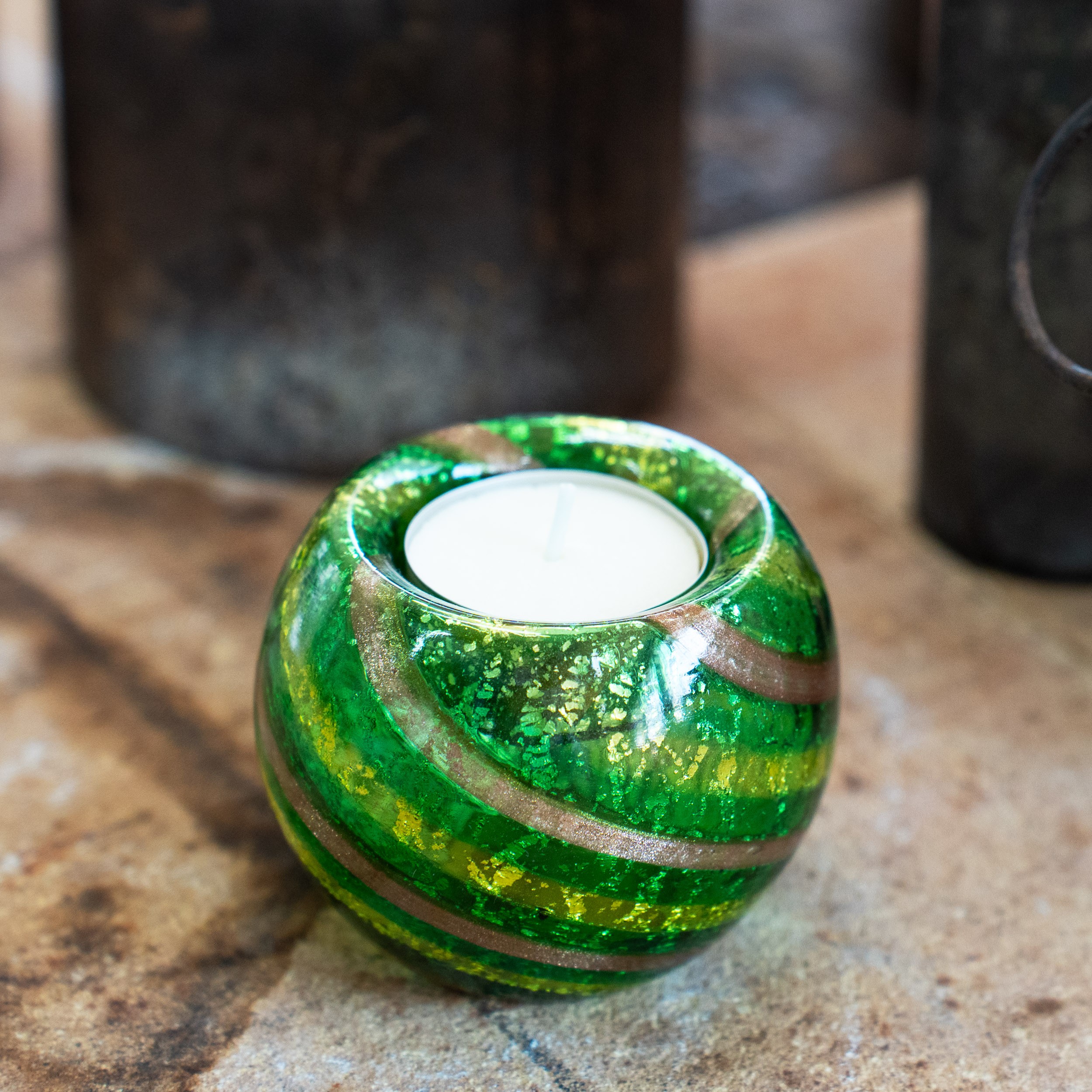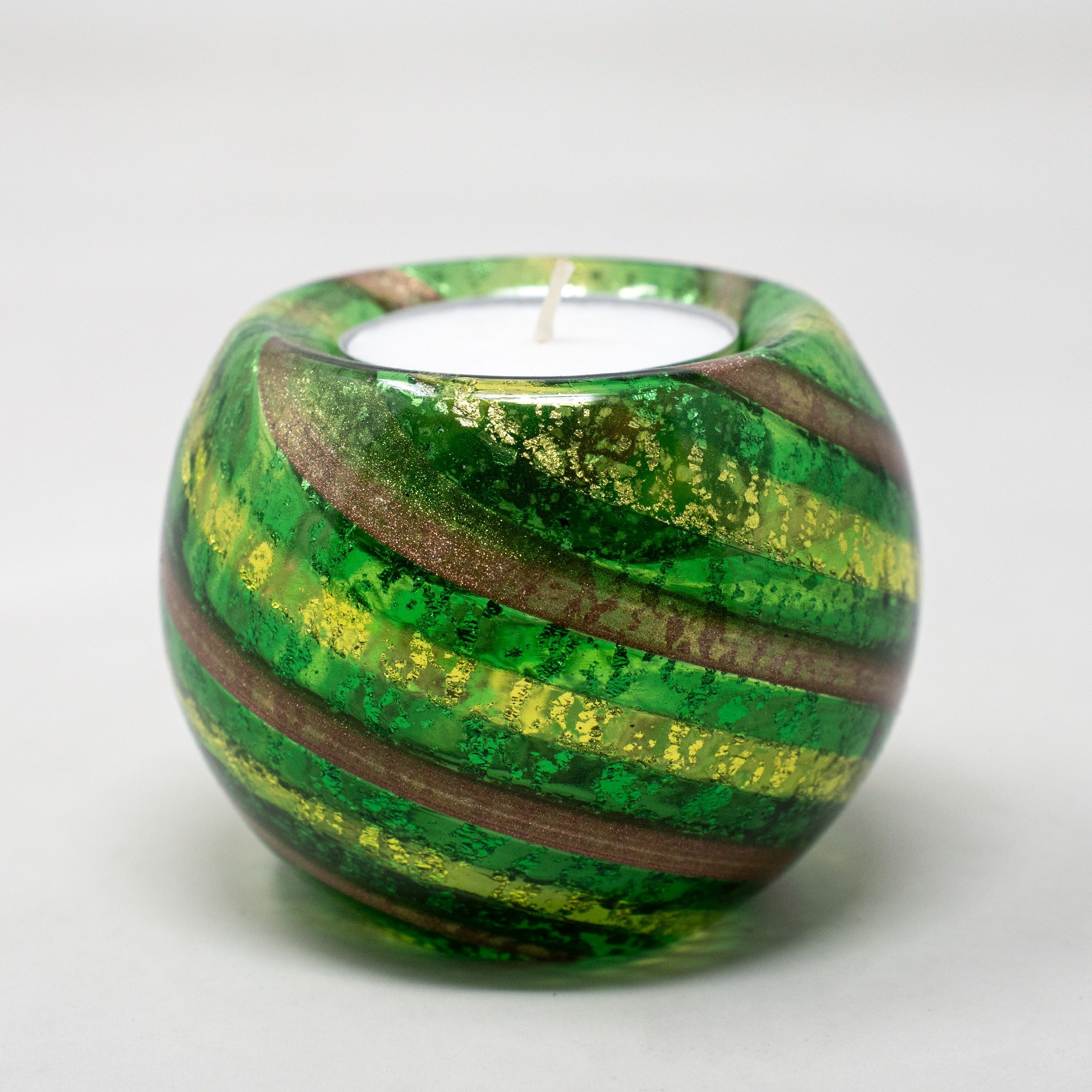 Portacandela rotondo in vetro di Murano con canne spirali e avventurina