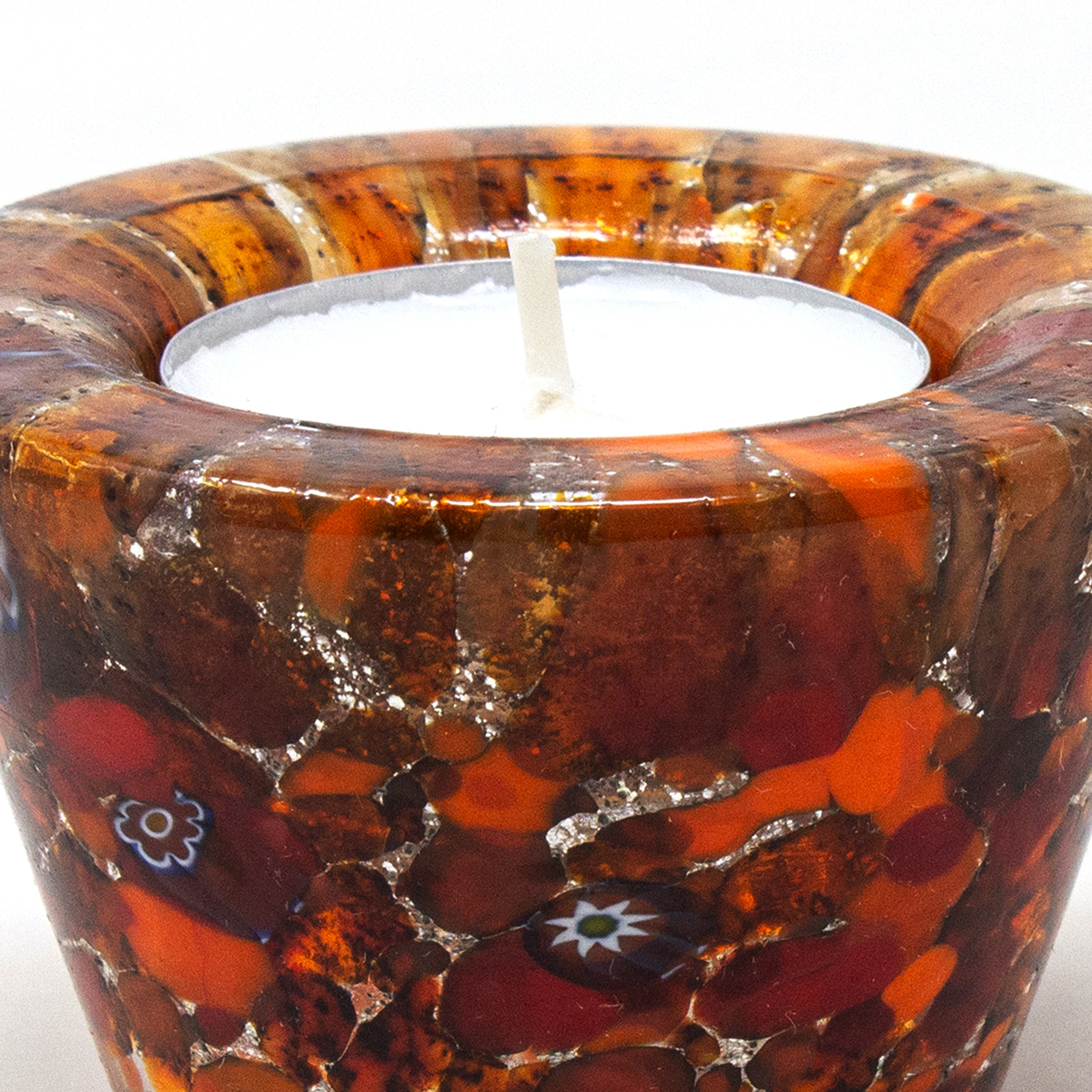 Portacandela conico in vetro di Murano con murrine e graniglie nei toni ambrati