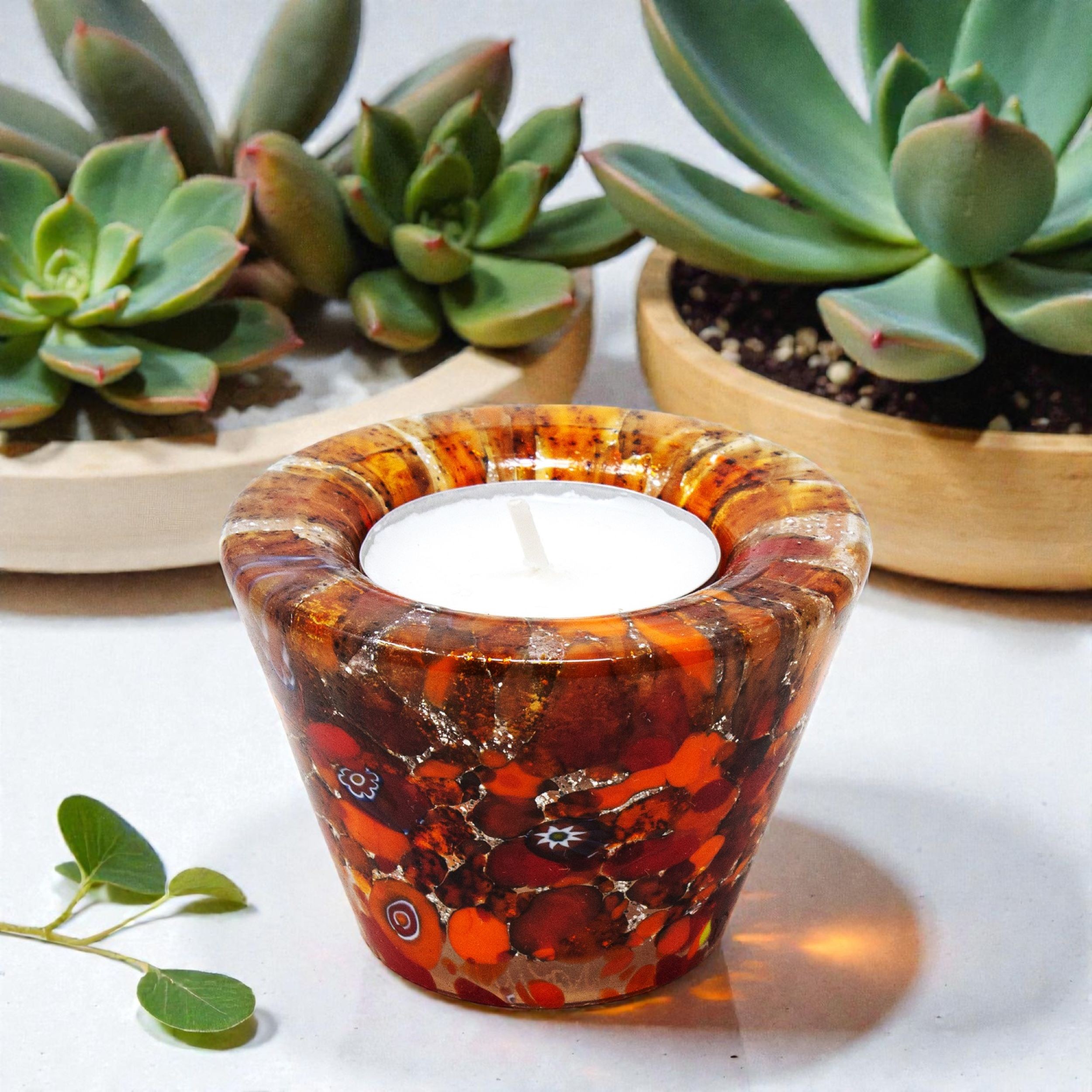Raffinato portacandela conico in autentico vetro di Murano, realizzato a mano dai maestri vetrai nei toni del vetro ambrati, impreziosito da murrine e screziato in foglia argento. Ideale per tealight, diffonde una luce calda e preziosa, aggiungendo eleganza e artigianalità a qualsiasi ambiente.