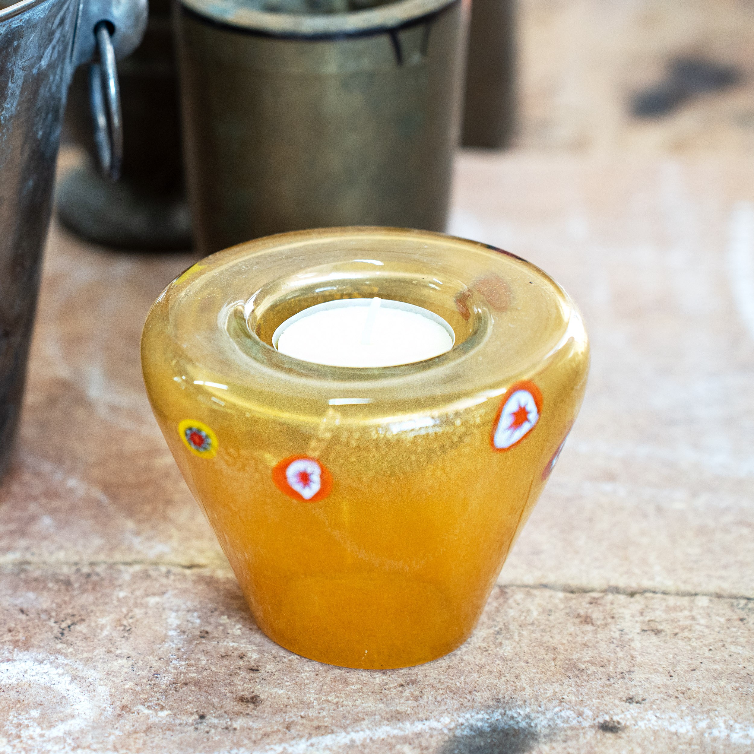 Portacandela conico in vetro di Murano colorato con murrine millefiori e foglia d’oro