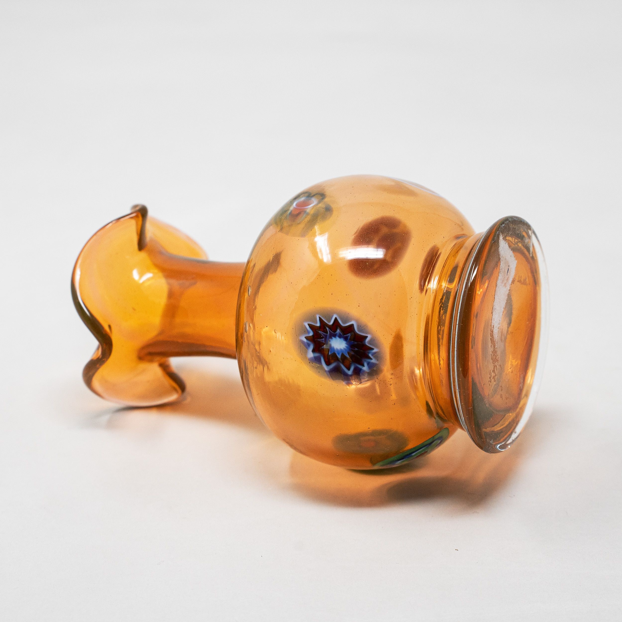 Vasetto artigianale in autentico vetro di Murano, realizzato a mano e impreziosito da vivaci murrine millefiori fuse nel vetro colorato. Forma a bottiglietta con collo a fazzoletto.
