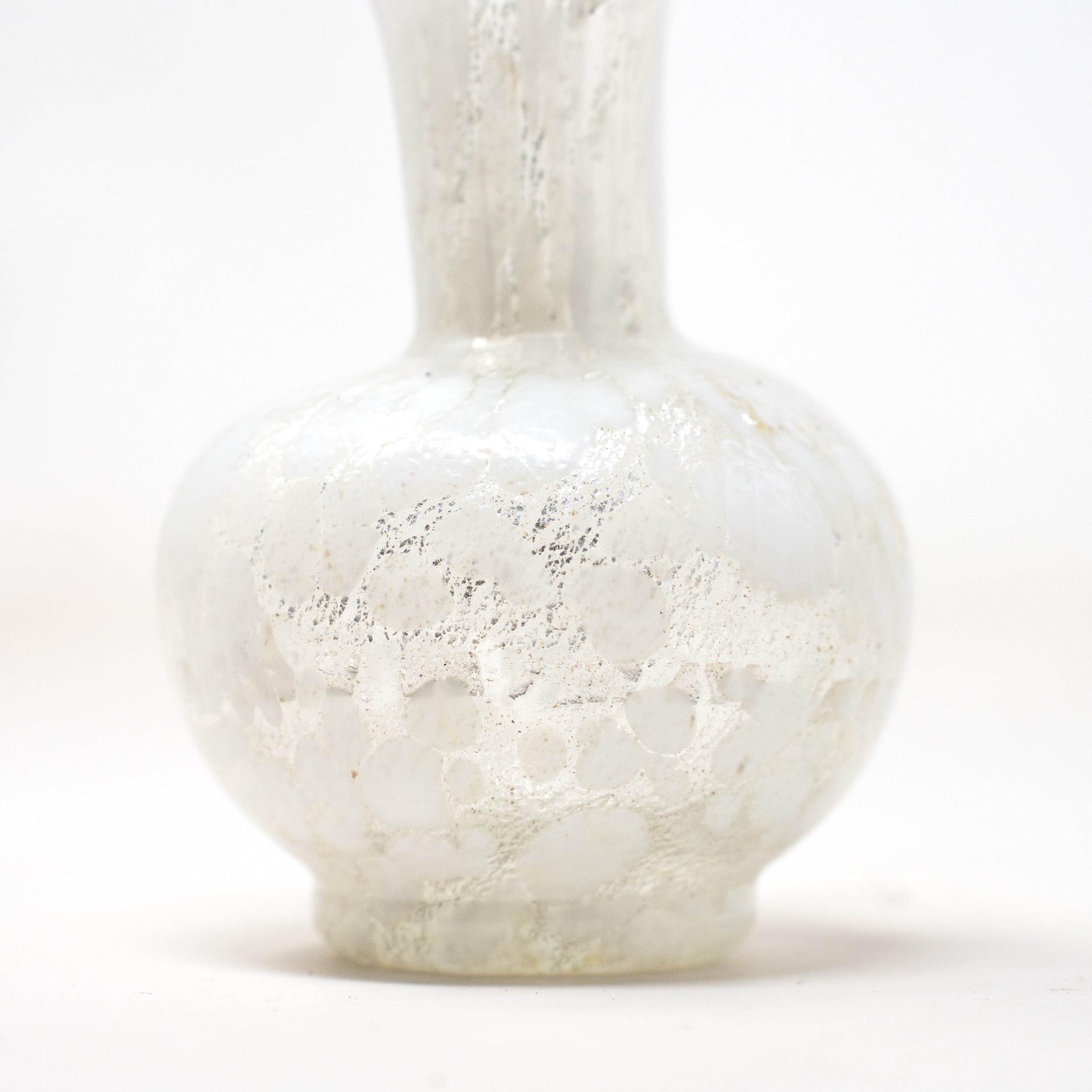 Vasetto artigianale in autentico vetro di Murano, realizzato a mano e impreziosito da graniglie colorate e murrine, infine screziato in foglia argento. Forma a botticella con collo a fazzoletto.