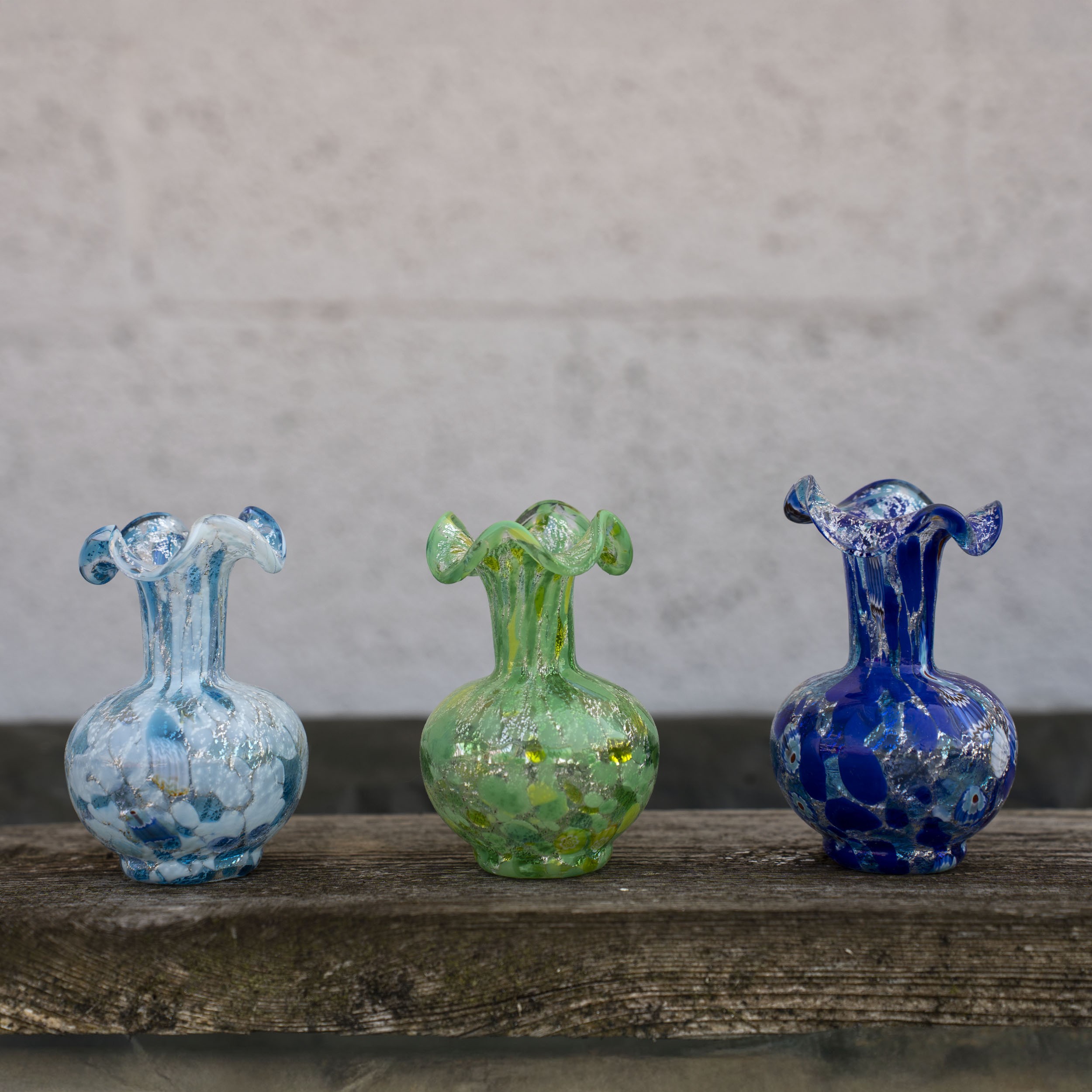 Vasetto artigianale in autentico vetro di Murano, realizzato a mano e impreziosito da graniglie colorate e murrine, infine screziato in foglia argento. Forma a botticella con collo a fazzoletto.